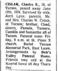 Charles B. Cislak, 19, of Tucson, passed away June 12th, 1974.