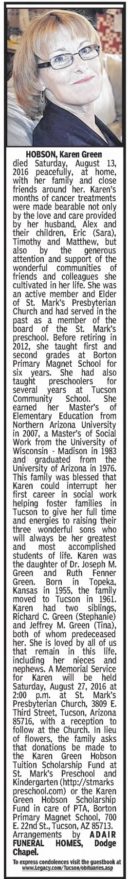 Hobson, Karen Green died Saturday, August 13, 2016 peacefully, at