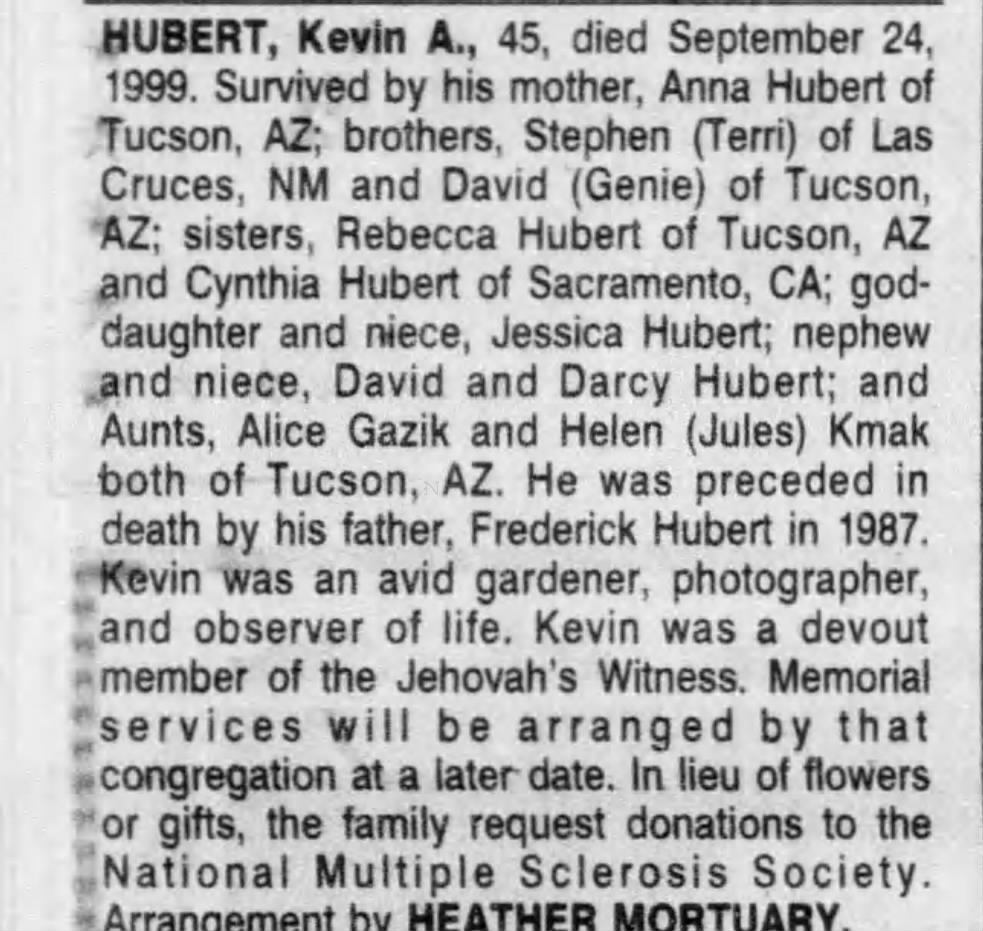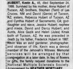 mother, Anna Hubert of Tucson, AZ; brothers, Stephen (Terri) of Las