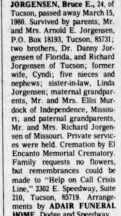 Jorgensen, Bruce E., 24, of Tucson, passed away March 15, 1980, (More...)